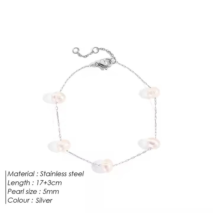 A perfect blend of elegance and modern style, this 14K gold PVD plated stainless steel bracelet features a delicate irregular chain design adorned with 5mm freshwater pearls. The 17+3cm adjustable length ensures a comfortable fit, making it ideal for both casual and formal looks. Crafted from titanium steel, it’s tarnish-resistant, hypoallergenic, and durable for long-lasting wear.